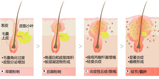 内分泌紊乱、微生物异常繁殖、化学物质接触等因素刺激皮脂腺细胞分泌异常,造成皮脂腺细胞受损→细胞分泌失衡→毛囊导管细胞角化→毛孔堵塞→形成粉刺问题。