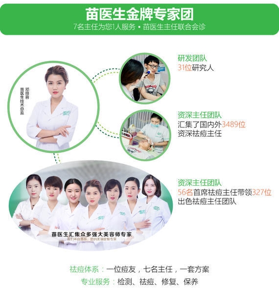 专家团队专业祛痘全国连锁机构 苗医生作为专业祛痘连锁品牌,目前已成立了近千家专业祛痘机构。汇集了数以千位资深祛痘主任,以“一位痘友,一名主任,一套方案”的祛痘体系,及“安全、快速、可靠”的祛痘效果被评为业界祛痘金标准,深受广大痘友好评。